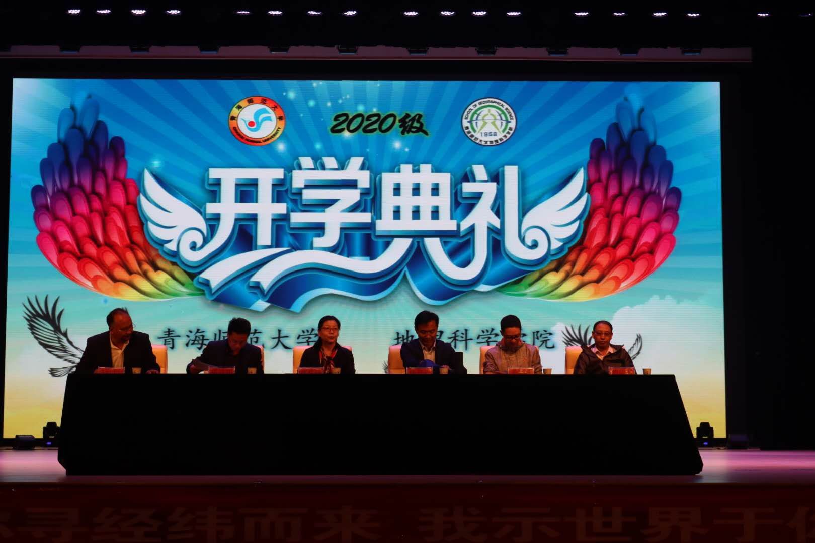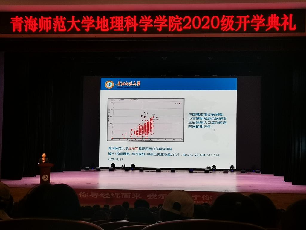 开学典礼由院党总支副书记洛加才让主持。在庄严的国歌声中开学典礼拉开了序幕。首先院党总支书记杨登兴为新生讲授入学第一堂思想政治课,并对新同学提出几点希望和要求:1.早睡早起,强身健体;2.学好专业课的同时学好英语,为考研、就业做好准备;3.选择心仪的学生社团,在不同的领域发光出彩;4.严守校纪校规,不逾越法律红线。随后,金彦香老师和蔡玉静同学为新生送上殷殷期盼和真心祝福,2020级学生文诗怡代表新生向老师和同学们表达了要坚定信仰、崇尚科学,厚植情怀的决心。典礼上学院表彰了“新葡萄8883官网AMG2019-2020学年文明宿舍、优秀就创团队、本科生专业技能大赛”的获奖团体及个人,为新生树立起良好的学习标杆。最后,院长葛岳静教授以“从走近地理学到走进地理学”为题开讲“地理学第一课”,她向同学们讲述了什么是地理学,如何真正走进地理学,并通过前沿的科学研究为同学们指明了未来学习和研究的方向,全院师生受益匪浅。