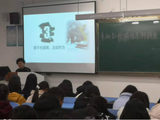 讲座中,陈老师从班主任工作的现状、班主任工作的智慧、班主任工作与育人使命等方面展开了介绍。陈老师以丰富详实的案例,指出班主任工作是学校教育教学工作的灵魂,是学校德育工作的主阵地,作为一名合格的师范生,除了掌握丰富的科学文化知识、精深的学科专业知识和必要的教育教学技能外,熟练掌握班主任工作技能也是十分必要的;目前的师范教育培养体系中,班主任工作技能的培养没有引起足够的重视,缺乏必要的课程设置和培训体系,不利于师范生教育教学技能和教师职业素养的提升。针对如何将班主任工作与学科教学技能深度融合并落实到教学实践中,陈老师从教师的事业心与责任心、班主任工作的智慧、班主任的爱心等方面,探讨了从学科教师到优秀班主任的工作方法和策略。在讲座中,陈老师以亲身经历的班主任工作案例,和同学们分享了班主任工作的感受与启发,给同学们上了一堂生动形象的职业教育课。整场讲座气氛热烈,同学们认真听讲,并对刚结束的教育见习活动中的疑惑进行了积极互动,陈老师认真而精彩的回答,赢得了同学热烈的掌声。