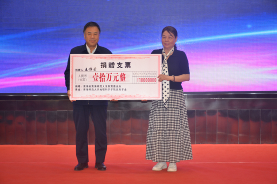 毕业典礼在雄壮的国歌声中拉开帷幕。首先进行的是“江源优秀学子奖、江源优秀教师奖”捐赠仪式,捐赠仪式由青海省青海师范大学教育基金会秘书长杨迎春主持。北京师范大学“四有好老师”金质奖章获得者王静爱教授将10万元奖金全部捐赠给青海省青海师范大学教育基金会,用于奖励地理科学院优秀学子、优秀教师。校党委副书记、常务副校长、青海师范大学教育基金会副理事长马德明代表基金会接受捐赠并向王静爱颁发捐赠证书。马德明在讲话中代表基金会向王静爱老师表达了诚挚谢意,王静爱老师发表了热情洋溢的致辞,希望学院师生像习近平总书记要求的那样,争做有理想信念、有道德情操、有扎实学识、有仁爱之心的"四有"好老师。随后,马德明副理事长、王静爱教授向学院获得“第二届江源优秀学子奖”的获奖同学颁发了荣誉证书和奖金。