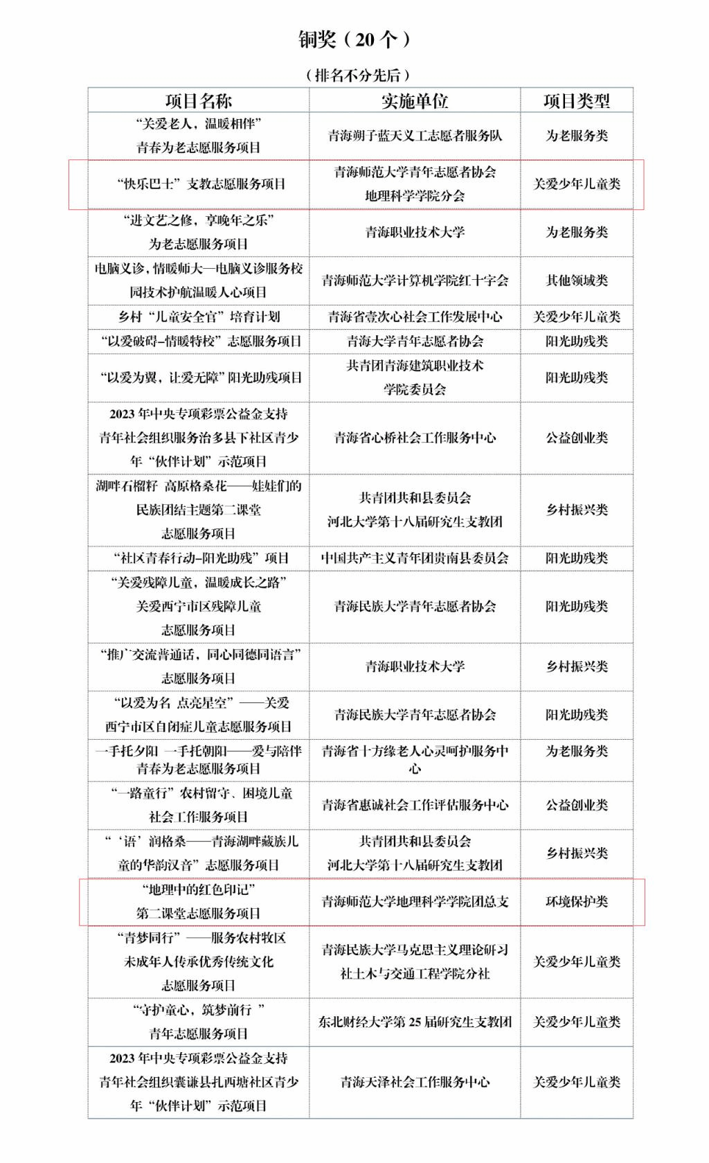 6月29日,由团省委、省青志协主办的2024年“招行杯”青海省青年志愿服务项目大赛决赛顺利举行。经过48个项目的激烈角逐,新葡萄报送的“快乐巴士”支教志愿服务项目、“地理中的红色印记”第二课堂志愿服务项目均斩获铜奖。