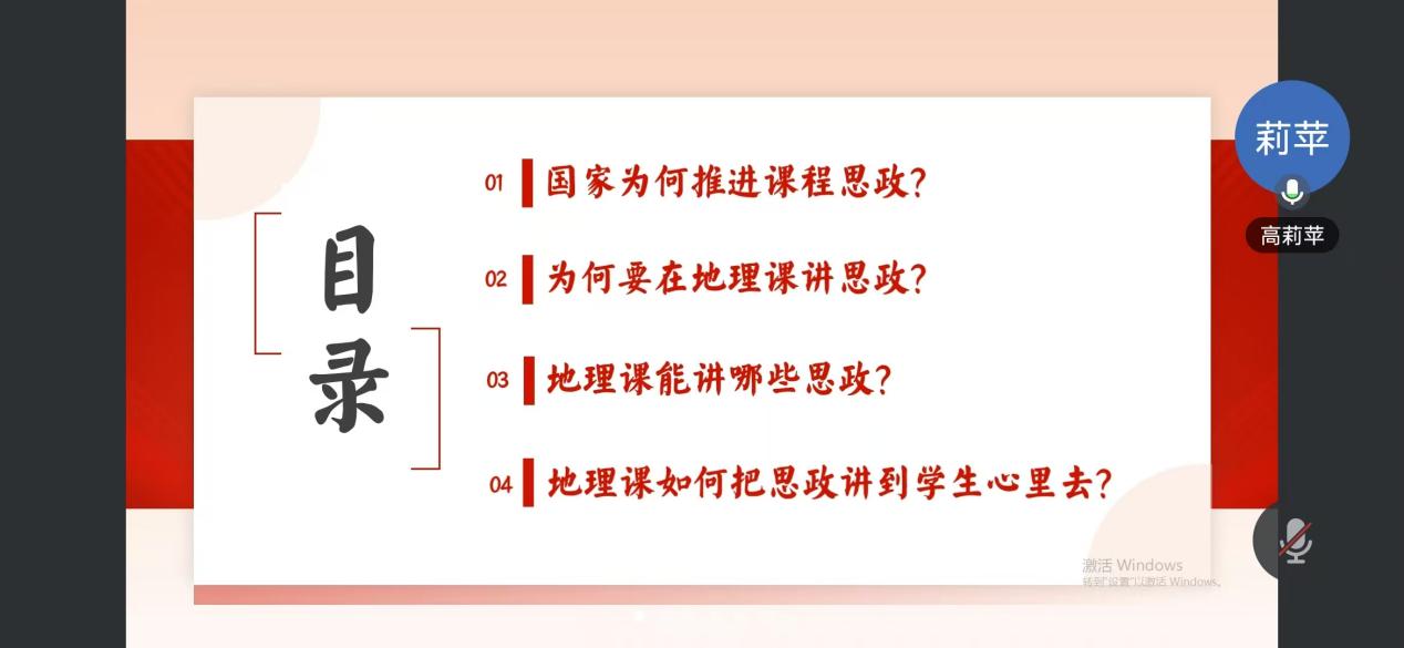 针对地理学科特色,高莉苹副教授围绕“为何要在地理课讲思政”展开深入阐释,指出地理学科与思政教育具有天然契合性,地理课程中的山河格局、资源分布、区域发展等内容,正是承载思政教育的优质载体。在“地理课能讲哪些思政”环节,她结合青海师范大学课程思政建设要求,提出可重点挖掘三类元素:一是生态文明元素;二是中华民族共同体元素;三是家国情怀元素。