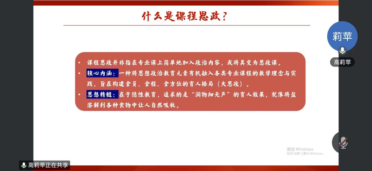为深入贯彻落实习近平总书记关于教育的重要论述及全国高校思想政治工作会议精神,全面推进课程思政建设与专业教育深度融合,切实提升教师课程思政育人能力,2025年11月3日,新葡萄8883官网AMG组织全体教师开展课程思政专题线上座谈交流会。本次会议特别邀请马克思主义学院高莉苹副教授担任主讲嘉宾,围绕课程思政建设的核心命题展开深度分享。