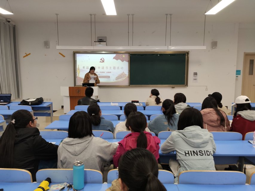 本次活动首先由学生党员许钟霖向大家阐述了入党志愿书的重要性,之后由优秀学生党员代表王思晴向大家朗读了几份优秀的入党志愿书,让大家一起学习并回忆当时写入党申请书的那份激情,让大家感慨万千。