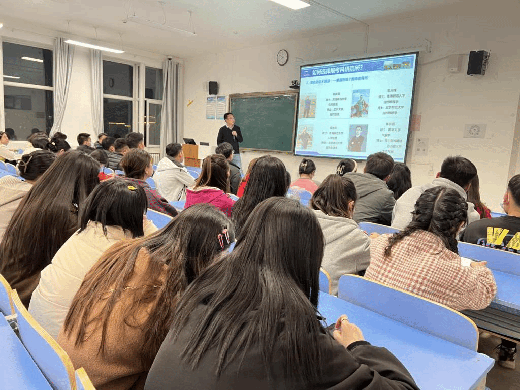 讲座上,张进虎老师从“为什么要考研”“如何选择报考科研院所”“推荐院校历年分数统计”“上岸学子考研经验分享”等四个方面进行了生动详细的阐述,并结合近年来考研大数据、学院研究生招录情况等方面,与现场同学互动交流。最后,在备考时间、复习方法上进行了深入辅导。同学们认真聆听,积极互动,气氛热烈。